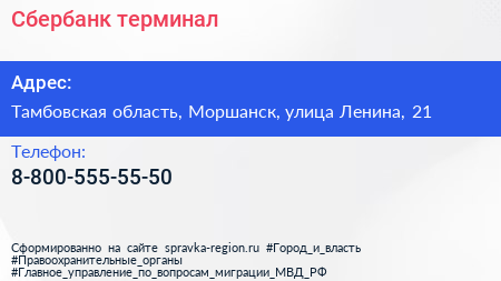Сбербанк, терминал по адресу Тамбовская область, Моршанск, улица Ленина, 21 в дальнейшем Организация, размещена в следующих категориях: