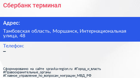 Сбербанк, терминал по адресу Тамбовская область, Моршанск, Интернациональная улица, 48 в дальнейшем Организация, размещена в следующих категориях: