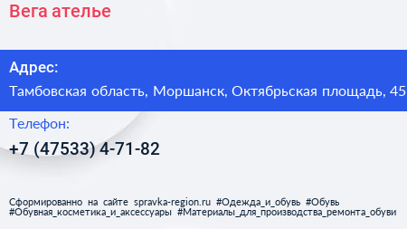 Вега, ателье по адресу Тамбовская область, Моршанск, Октябрьская площадь, 45 в дальнейшем Организация, размещена в следующих категориях: