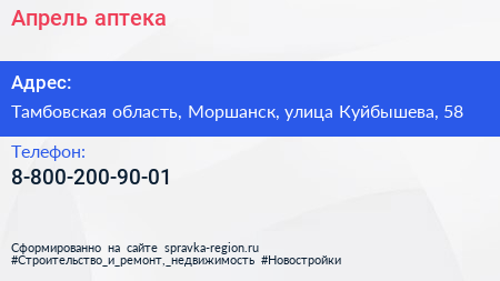 Апрель, аптека по адресу Тамбовская область, Моршанск, улица Куйбышева, 58 в дальнейшем Организация, размещена в следующих категориях:
