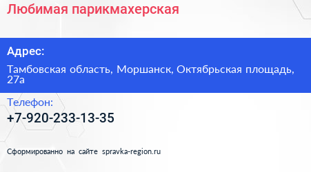 Любимая, парикмахерская по адресу Тамбовская область, Моршанск, Октябрьская площадь, 27а в дальнейшем Организация, размещена в следующих категориях: