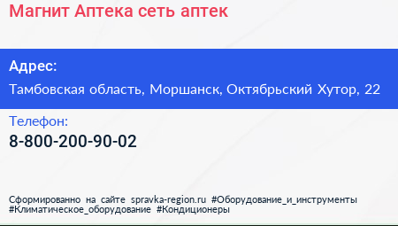 Магнит Аптека, сеть аптек по адресу Тамбовская область, Моршанск, Октябрьский Хутор, 22 в дальнейшем Организация, размещена в следующих категориях:
