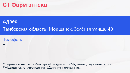 СТ-Фарм, аптека по адресу Тамбовская область, Моршанск, Зелёная улица, 43 в дальнейшем Организация, размещена в следующих категориях: