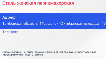 Стиль, женская парикмахерская по адресу Тамбовская область, Моршанск, Октябрьская площадь, 45 в дальнейшем Организация, размещена в следующих категориях: