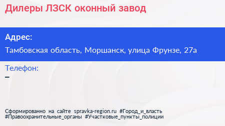 Дилеры ЛЗСК, оконный завод по адресу Тамбовская область, Моршанск, улица Фрунзе, 27а в дальнейшем Организация, размещена в следующих категориях: