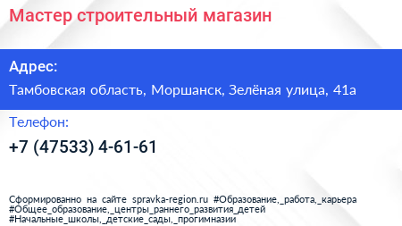 Мастер, строительный магазин по адресу Тамбовская область, Моршанск, Зелёная улица, 41а в дальнейшем Организация, размещена в следующих категориях: