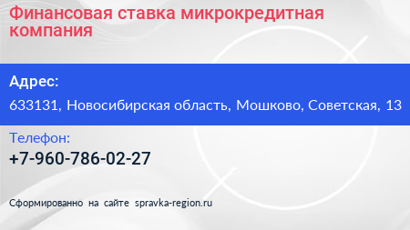 Финансовая ставка, микрокредитная компания по адресу 633131, Новосибирская область, Мошково, Советская, 13 в дальнейшем Организация, размещена в следующих категориях:
