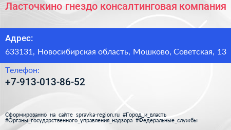 Ласточкино гнездо, консалтинговая компания по адресу 633131, Новосибирская область, Мошково, Советская, 13 в дальнейшем Организация, размещена в следующих категориях: