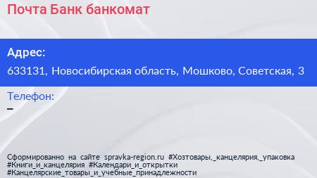 Почта Банк, банкомат по адресу 633131, Новосибирская область, Мошково, Советская, 3 в дальнейшем Организация, размещена в следующих категориях: