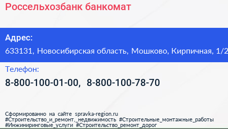 Россельхозбанк, банкомат по адресу 633131, Новосибирская область, Мошково, Кирпичная, 1/2 в дальнейшем Организация, размещена в следующих категориях: