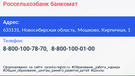 Россельхозбанк, банкомат по адресу 633131, Новосибирская область, Мошково, Кирпичная, 1 в дальнейшем Организация, размещена в следующих категориях: