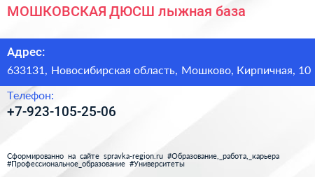 МОШКОВСКАЯ ДЮСШ, лыжная база по адресу 633131, Новосибирская область, Мошково, Кирпичная, 10 в дальнейшем Организация, размещена в следующих категориях: