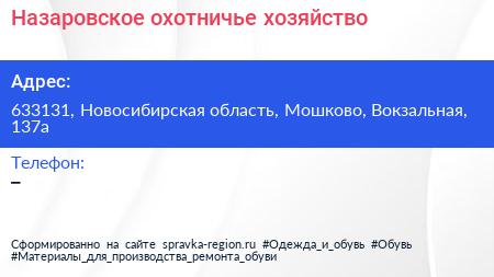 Назаровское, охотничье хозяйство по адресу 633131, Новосибирская область, Мошково, Вокзальная, 137а в дальнейшем Организация, размещена в следующих категориях: