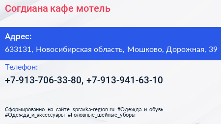 Согдиана, кафе-мотель по адресу 633131, Новосибирская область, Мошково, Дорожная, 39 в дальнейшем Организация, размещена в следующих категориях: