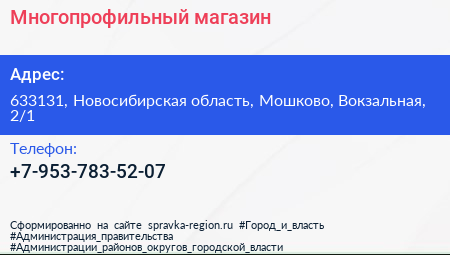 Многопрофильный магазин по адресу 633131, Новосибирская область, Мошково, Вокзальная, 2/1 в дальнейшем Организация, размещена в следующих категориях: