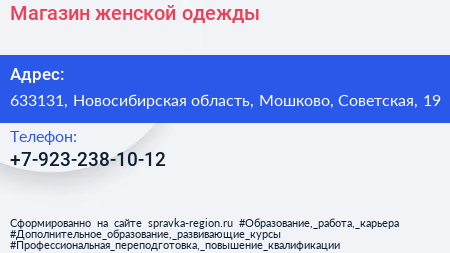 Магазин женской одежды по адресу 633131, Новосибирская область, Мошково, Советская, 19 в дальнейшем Организация, размещена в следующих категориях: