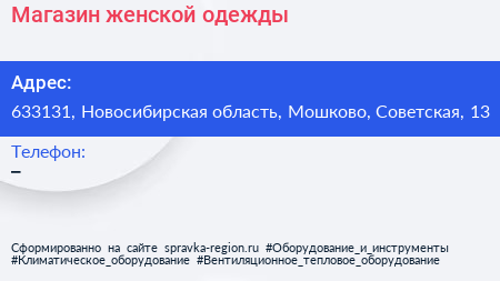 Магазин женской одежды по адресу 633131, Новосибирская область, Мошково, Советская, 13 в дальнейшем Организация, размещена в следующих категориях: