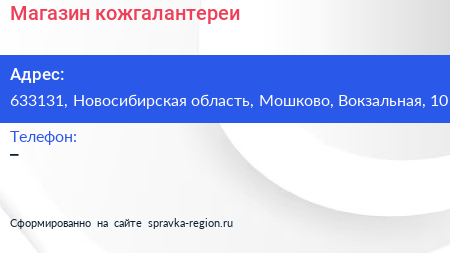 Магазин кожгалантереи по адресу 633131, Новосибирская область, Мошково, Вокзальная, 10 в дальнейшем Организация, размещена в следующих категориях: