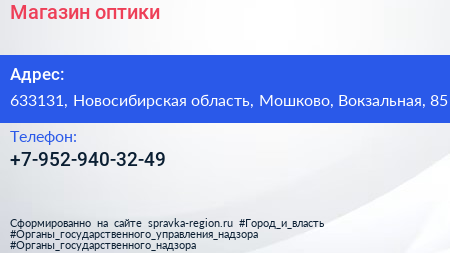 Магазин оптики по адресу 633131, Новосибирская область, Мошково, Вокзальная, 85 в дальнейшем Организация, размещена в следующих категориях: