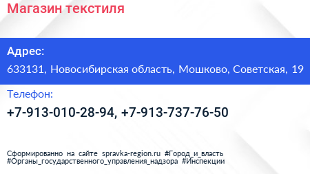 Магазин текстиля по адресу 633131, Новосибирская область, Мошково, Советская, 19 в дальнейшем Организация, размещена в следующих категориях: