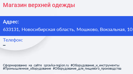 Магазин верхней одежды по адресу 633131, Новосибирская область, Мошково, Вокзальная, 10 в дальнейшем Организация, размещена в следующих категориях: