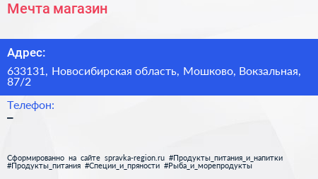 Мечта, магазин по адресу 633131, Новосибирская область, Мошково, Вокзальная, 87/2 в дальнейшем Организация, размещена в следующих категориях:
