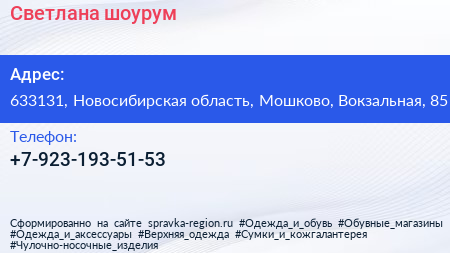 Светлана, шоурум по адресу 633131, Новосибирская область, Мошково, Вокзальная, 85 в дальнейшем Организация, размещена в следующих категориях: