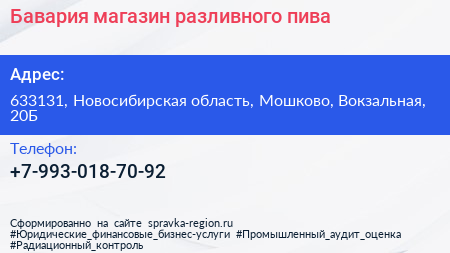 Бавария, магазин разливного пива по адресу 633131, Новосибирская область, Мошково, Вокзальная, 20Б в дальнейшем Организация, размещена в следующих категориях: