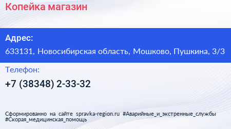 Копейка, магазин по адресу 633131, Новосибирская область, Мошково, Пушкина, 3/3 в дальнейшем Организация, размещена в следующих категориях: