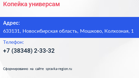 Копейка, универсам по адресу 633131, Новосибирская область, Мошково, Колхозная, 1 в дальнейшем Организация, размещена в следующих категориях: