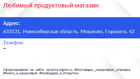 Любимый, продуктовый магазин по адресу 633131, Новосибирская область, Мошково, Горького, 42 в дальнейшем Организация, размещена в следующих категориях: