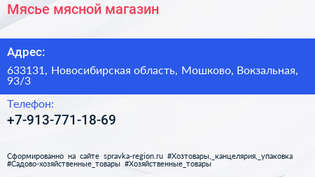 Мясье, мясной магазин по адресу 633131, Новосибирская область, Мошково, Вокзальная, 93/3 в дальнейшем Организация, размещена в следующих категориях: