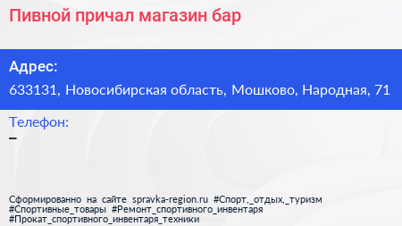 Пивной причал, магазин-бар по адресу 633131, Новосибирская область, Мошково, Народная, 71 в дальнейшем Организация, размещена в следующих категориях: