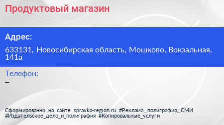 Продуктовый магазин по адресу 633131, Новосибирская область, Мошково, Вокзальная, 141а в дальнейшем Организация, размещена в следующих категориях: