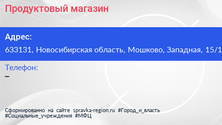 Продуктовый магазин по адресу 633131, Новосибирская область, Мошково, Западная, 15/1 в дальнейшем Организация, размещена в следующих категориях: