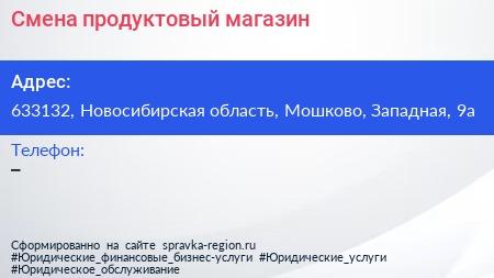 Смена, продуктовый магазин по адресу 633132, Новосибирская область, Мошково, Западная, 9а в дальнейшем Организация, размещена в следующих категориях: