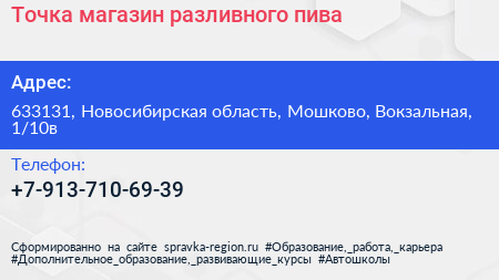 Точка, магазин разливного пива по адресу 633131, Новосибирская область, Мошково, Вокзальная, 1/10в в дальнейшем Организация, размещена в следующих категориях: