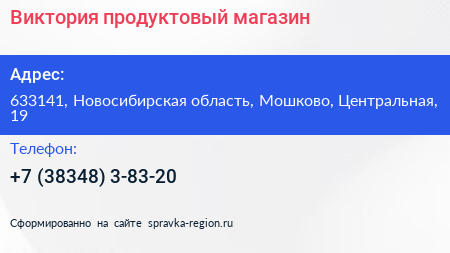 Виктория, продуктовый магазин по адресу 633141, Новосибирская область, Мошково, Центральная, 19 в дальнейшем Организация, размещена в следующих категориях: