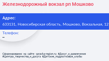 Железнодорожный вокзал, рп. Мошково по адресу 633131, Новосибирская область, Мошково, Вокзальная, 12 в дальнейшем Организация, размещена в следующих категориях: