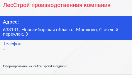 ЛесСтрой, производственная компания по адресу 633141, Новосибирская область, Мошково, Светлый переулок, 3 в дальнейшем Организация, размещена в следующих категориях: