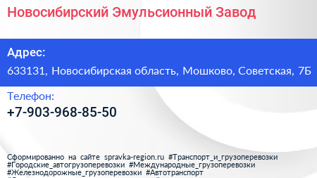 Новосибирский Эмульсионный Завод по адресу 633131, Новосибирская область, Мошково, Советская, 7Б в дальнейшем Организация, размещена в следующих категориях: