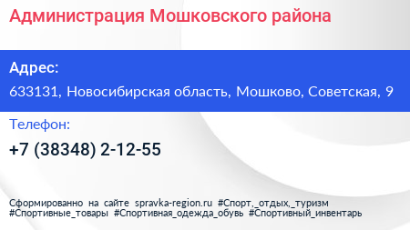 Администрация Мошковского района по адресу 633131, Новосибирская область, Мошково, Советская, 9 в дальнейшем Организация, размещена в следующих категориях: