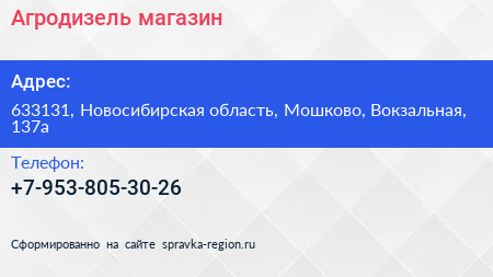 Агродизель, магазин по адресу 633131, Новосибирская область, Мошково, Вокзальная, 137а в дальнейшем Организация, размещена в следующих категориях: