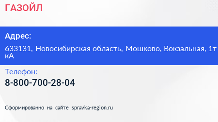 ГАЗОЙЛ по адресу 633131, Новосибирская область, Мошково, Вокзальная, 1т кА в дальнейшем Организация, размещена в следующих категориях: