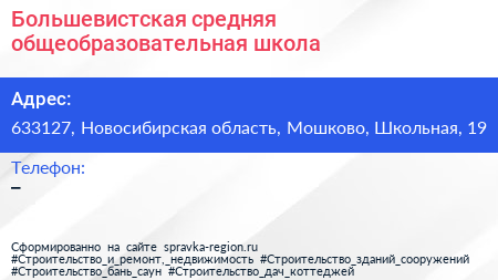 Большевистская средняя общеобразовательная школа по адресу 633127, Новосибирская область, Мошково, Школьная, 19 в дальнейшем Организация, размещена в следующих категориях: