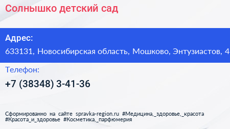 Солнышко, детский сад по адресу 633131, Новосибирская область, Мошково, Энтузиастов, 4 в дальнейшем Организация, размещена в следующих категориях: