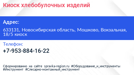 Киоск хлебобулочных изделий по адресу 633131, Новосибирская область, Мошково, Вокзальная, 18/5 киоск в дальнейшем Организация, размещена в следующих категориях: