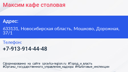 Максим, кафе-столовая по адресу 633131, Новосибирская область, Мошково, Дорожная, 37/1 в дальнейшем Организация, размещена в следующих категориях:
