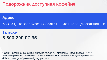 Подорожник, доступная кофейня по адресу 633131, Новосибирская область, Мошково, Дорожная, 1в в дальнейшем Организация, размещена в следующих категориях:
