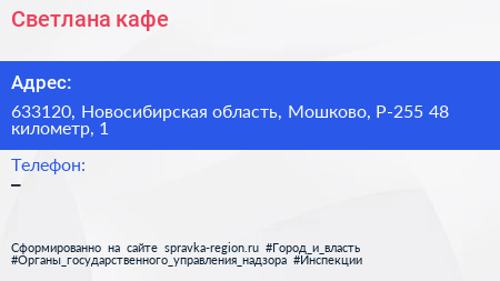 Светлана, кафе по адресу 633120, Новосибирская область, Мошково, Р-255 48 километр, 1 в дальнейшем Организация, размещена в следующих категориях: